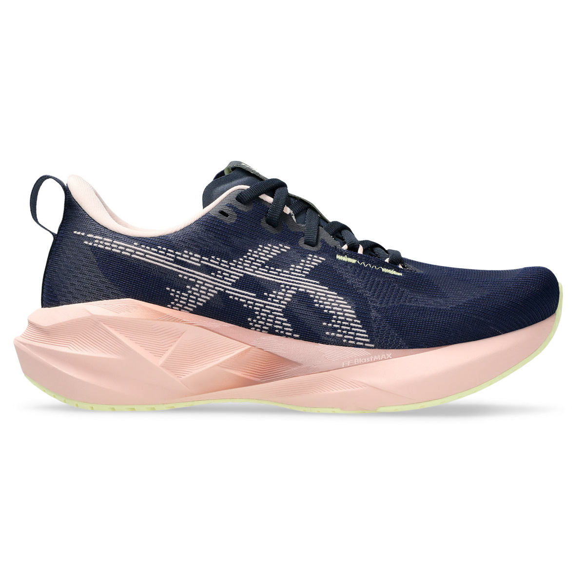 Asics Novablast 5 Midnight/Breeze dames is een neutrale lichte hardloopschoen met bijzonder hoge veerkracht en energieteruggave. Geschikt voor zowel rustige duurtrainingen als de snelle tempo's! Met FF BLAST MAX demping en het unieke geometrisch design in zowel tussenzool als buitenzool ervaar je een top combinatie tussen comfort en energieke passen.