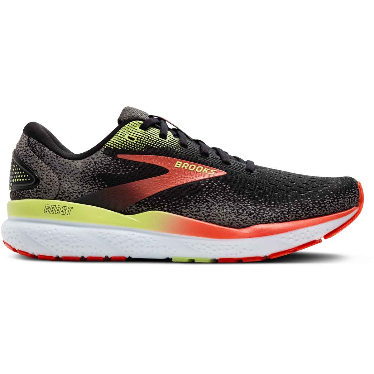 Brooks Ghost 16 Black/Manadarin Red/Green heren is een allround neutrale hardloopschoen met extra smalle leest geschikt voor neutrale lopers met smalle voeten.