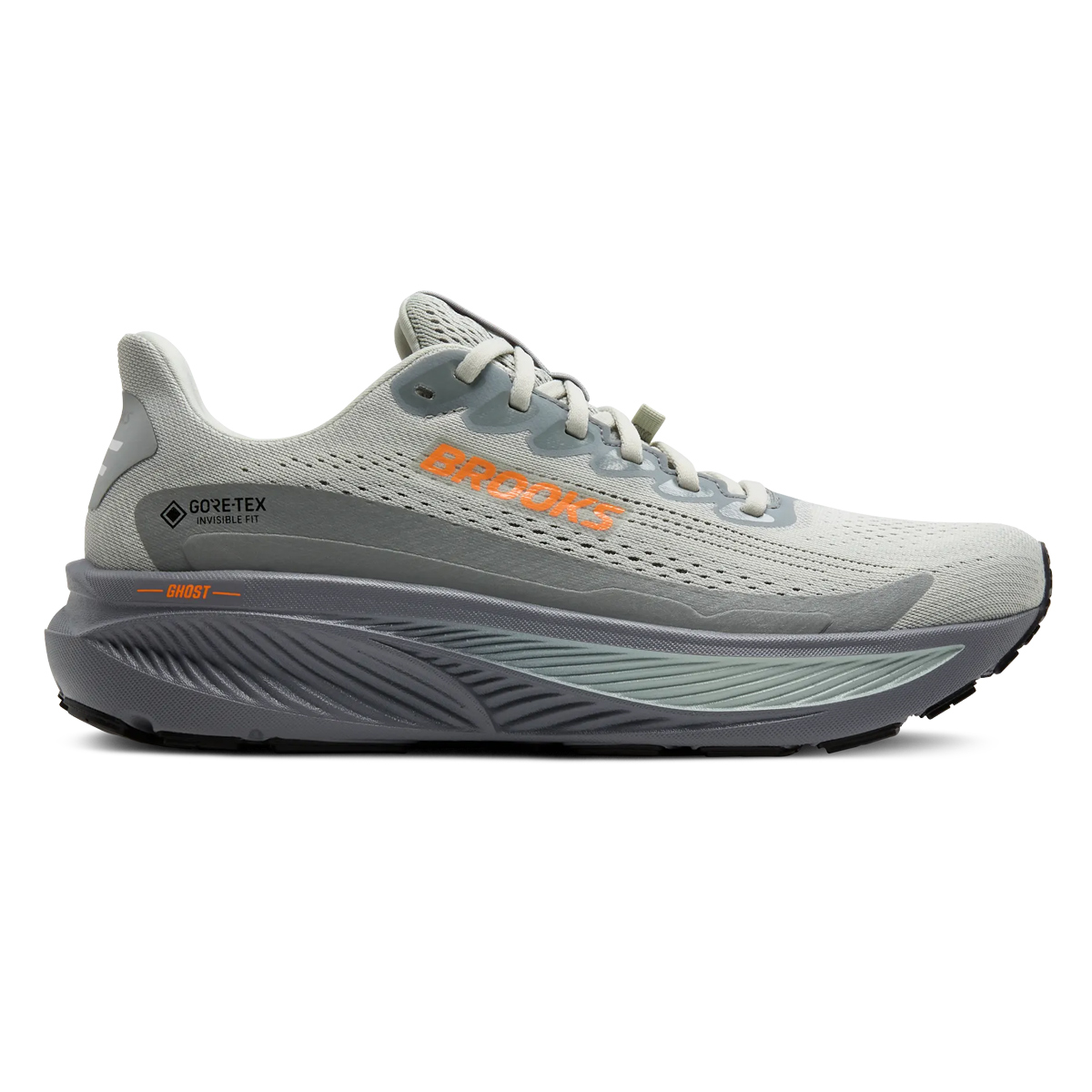 Brooks Ghost 17 GTX (moke/Primer Grey/Orange) heren is een populaire neutrale loopschoen onder sporters in de GTX uitvoering met Gore Tex membraam in het bovenwerk wat waterdicht en tegelijk ademend is.