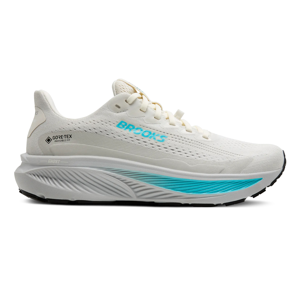 Brooks Ghost 17 (Coconut/Oyster/Blue) dames is een populaire neutrale loopschoen onder sporters in de GTX uitvoering met Gore Tex membraam in het bovenwerk wat waterdicht en tegelijk ademend is.