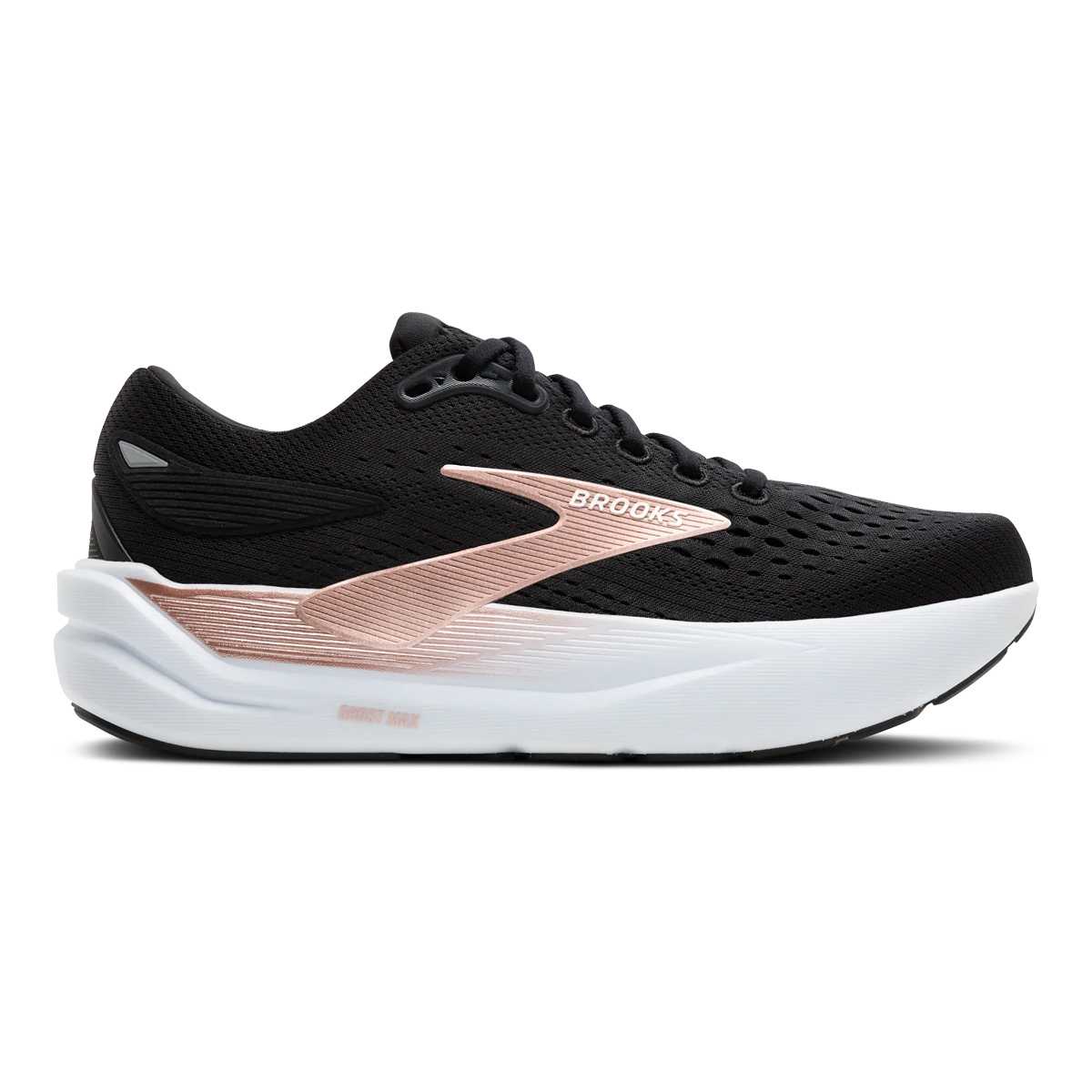 Brooks Ghost Max 3 (Black/Black/Rose Gold) dames is een duurzame stabiele neutrale hardloop/wandelschoen die perfect is voor dagelijks gebruik, in de sportschool en al die easy runs in het park!