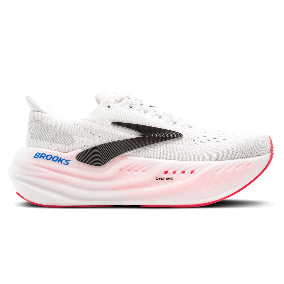 Brooks Glycerin Max White/Black/Diva Pink dames is een hardloopschoen met maximale demping door de hoogte en dikte van de zool. Het nieuwe DNA Tuned foam materiaal in die dikkere zool ervaart men als extreem comfortabel en dempend, met genoeg responsiviteit als je wil kunnen versnellen.