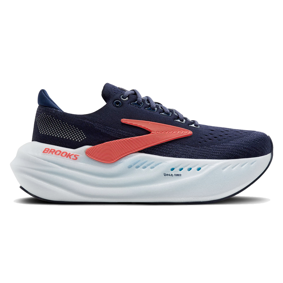Brooks Glycerin Max Peacoat/Blue Ribbon/Hot Coral dames is een hardloopschoen met maximale demping door de hoogte en dikte van de zool. Het nieuwe DNA Tuned foam materiaal in die dikkere zool ervaart men als extreem comfortabel en dempend, met genoeg responsiviteit als je wil kunnen versnellen.