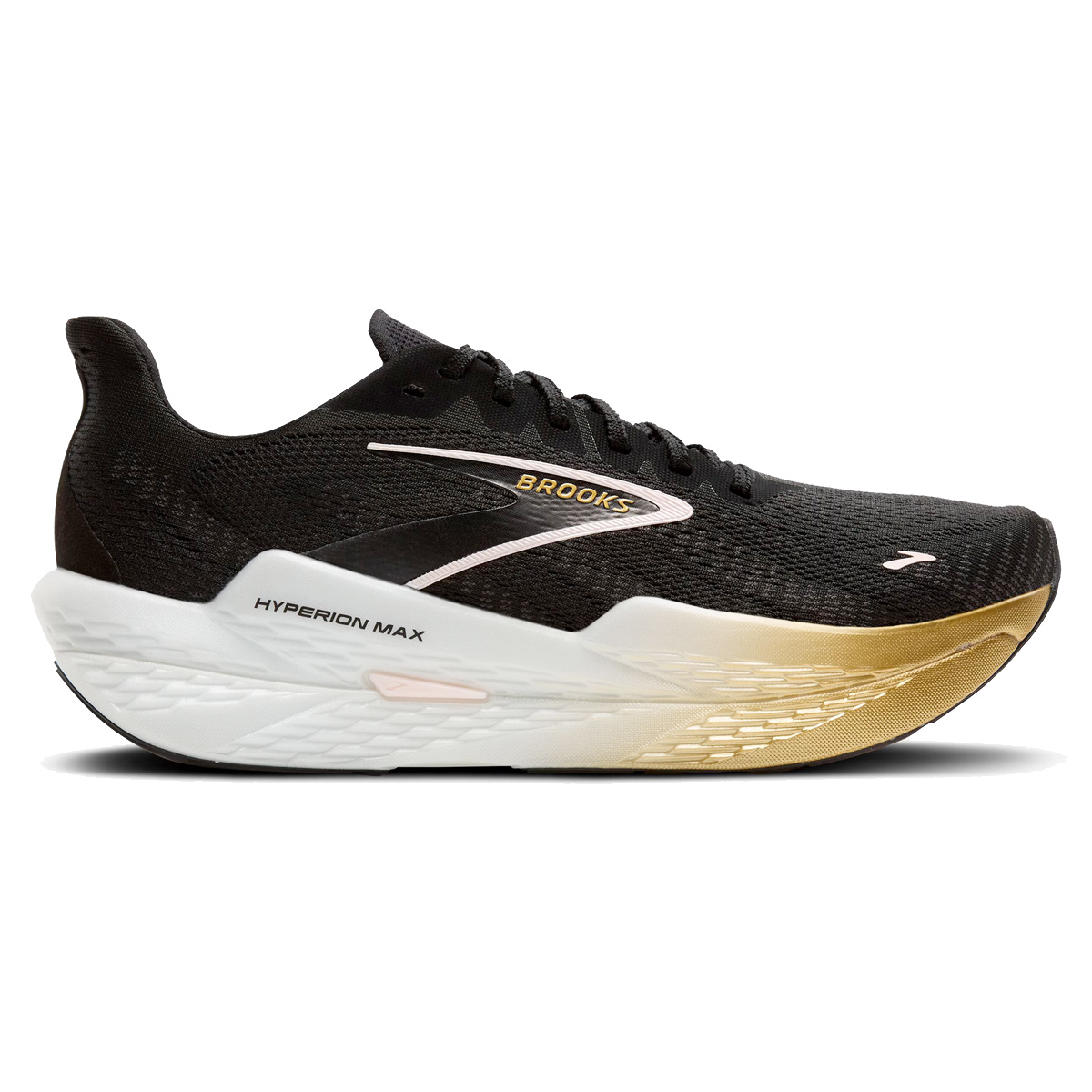 Brooks Hyperion Max 2 Black/Gold/pink dames is dé lichtgewicht neutrale snelle trainingsschoen van dit moment. Nieuw met een Speedvault Pebax/plaat voor nog snellere resultaten. Lichtgewicht, responsief met voldoende demping, duurzamere slijtzool, met de Hyperion Max is zelfs een halve marathon op hoog tempo een eitje!