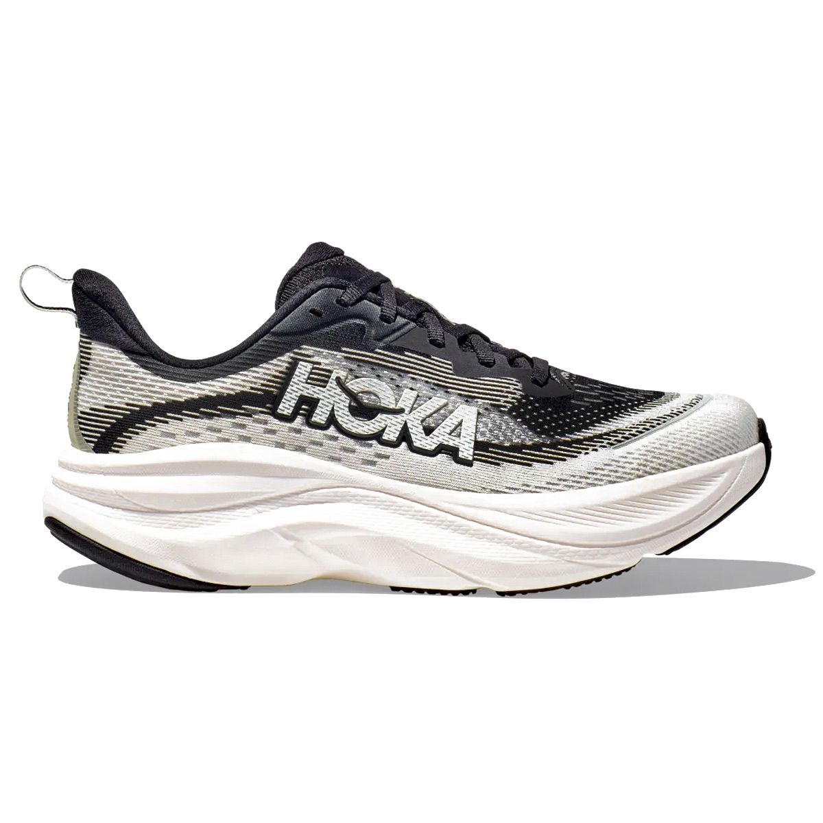 Het jaquardbovenwerk in de Skyflow runningshoe van HOKA geeft een strakke maar toch comfortabele fit. Dit bovenwerk is dan ook afgeleid van de Hoka Mach. De tong is vastgezet en zorgt samen met het vetersysteem dat de voet goed omlijst wordt.