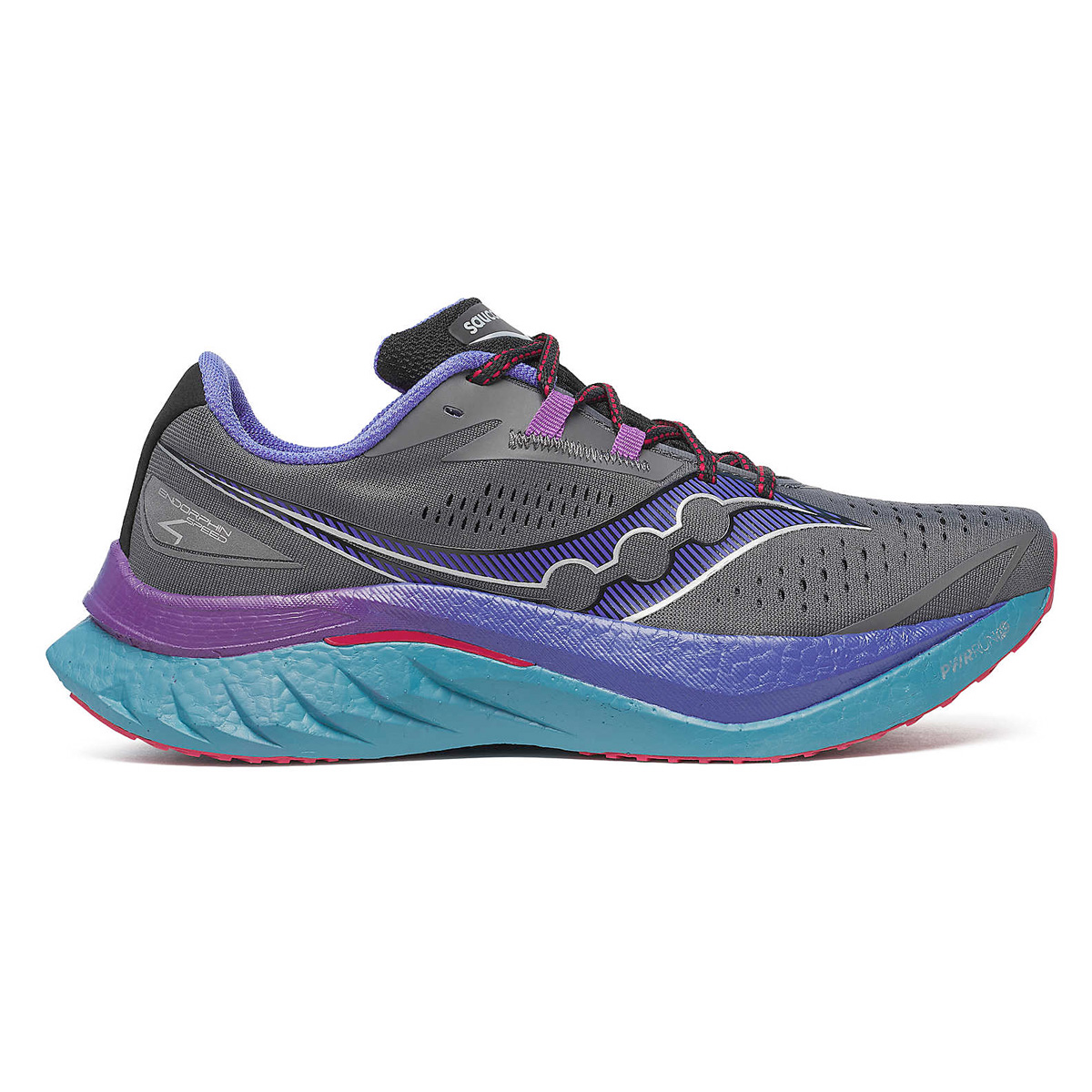 In de Saucony Speed 4 hardloopschoen zit een nylon plaat die anders is dan een carbonplaat, anders van vorm en meer flexibiliteit geeft aan de voorvoet. Daarmee is de Endorphin Speed 4 hardloopschoen uitermate geschikt voor voorvoetlanding.