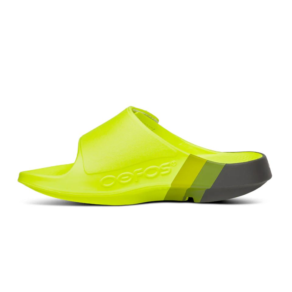 OOfos OOahh Sport Flex Luxe slide (Electro) is een makkelijke instap herstel slipper die stress verminderd op voeten en gewrichten. Deze luxe duurzame recovery slipper met klittenband sluiting verlicht pijn aan de voeten van bijvoorbeeld hielspoor en helpt de sporter of wandelaar sneller herstellen.