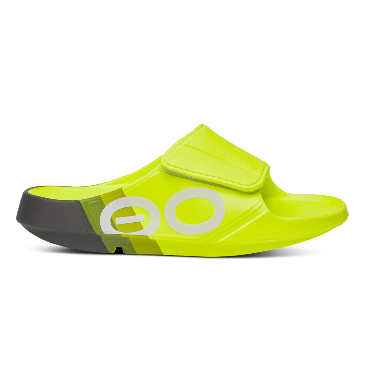 OOfos OOahh Sport Flex Luxe slide (Electro) is een makkelijke instap herstel slipper die stress verminderd op voeten en gewrichten. Deze luxe duurzame recovery slipper met klittenband sluiting verlicht pijn aan de voeten van bijvoorbeeld hielspoor en helpt de sporter of wandelaar sneller herstellen.
