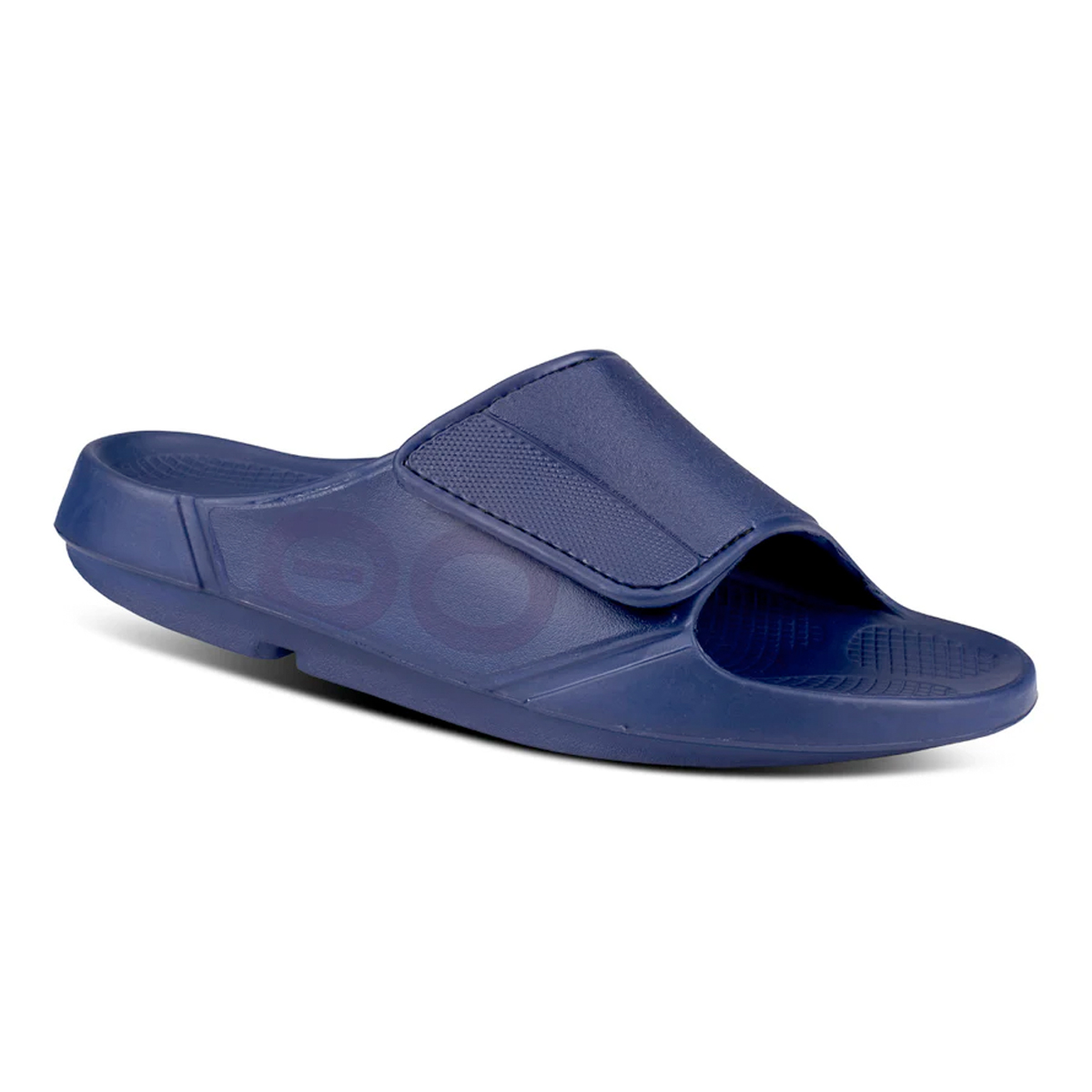OOfos OOAHH SPORT FLEX MATTE NAVY slides heren helpen bij herstel van de voeten na hardlopen of intensieve sporten. Deze sport flex variant is voorzien van een brede band over de wreef welke door middel van een klitteband sluiting gemakkelijk te verstellen is.