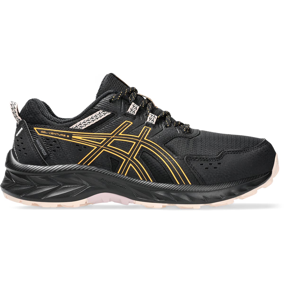 ASICS Gel Venture 9 WATERPROOF Black/Stadium Orange trailrunning schoen voor dames, nu met een interne sok constructie met getapete naden om het water te blocken.