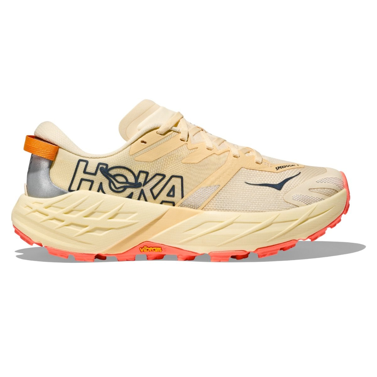 De Hoka Speedgoat 7 (Vintage Yellow/Neon Flame) trailrunning schoen dames biedt betrouwbare grip en beschermende demping voor lopers die kilometers maken op technisch terrein. Deze schoen is geschikt voor trailrunners en wandelaars die zekerheid zoeken op natte rotsen, losse paden en steile beklimmingen.