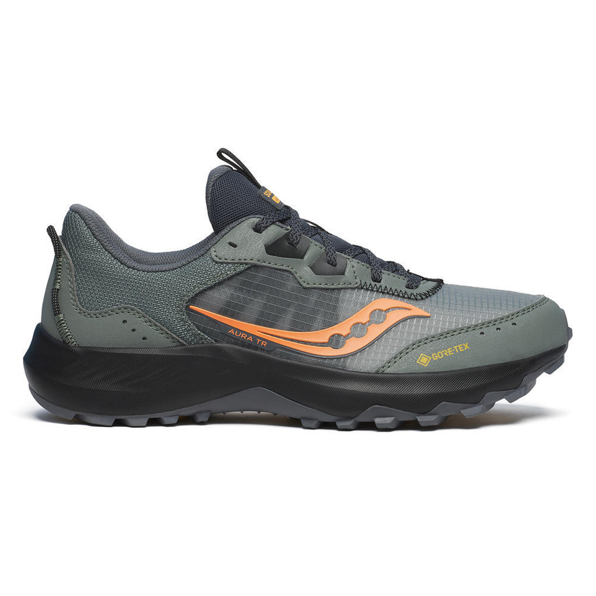 SAUCONY AURA TR GTX bough/peel olive foncee is een 100% waterdichte responsieve heren trailrunning schoen.