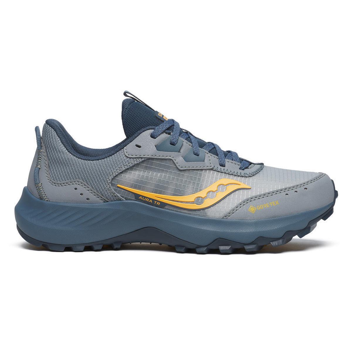 SAUCONY AURA TR GTX flint/peel blue moyen is een 100% waterdichte responsieve dames trailrunning schoen.