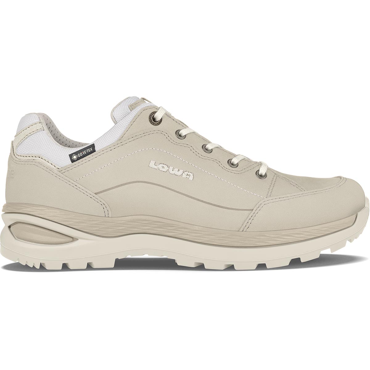 Lowa Renegade EVO GTX Lo champagne/panna dames wandelschoenen, is een type A schoen dat elk terrein moeiteloos aan kan. Deze wandelschoenen garanderen waterdichtheid doormiddel van het GORE-TEX GTX membraan en zijn dusdanig ademend dat de voeten comfortabel blijven. Dit is de volledig leergevoerde versie uit de Renegade serie. Een geupdate luchtigere versie, ideaal voor warmere temperaturen met een zachte dempende PU tussenzool.